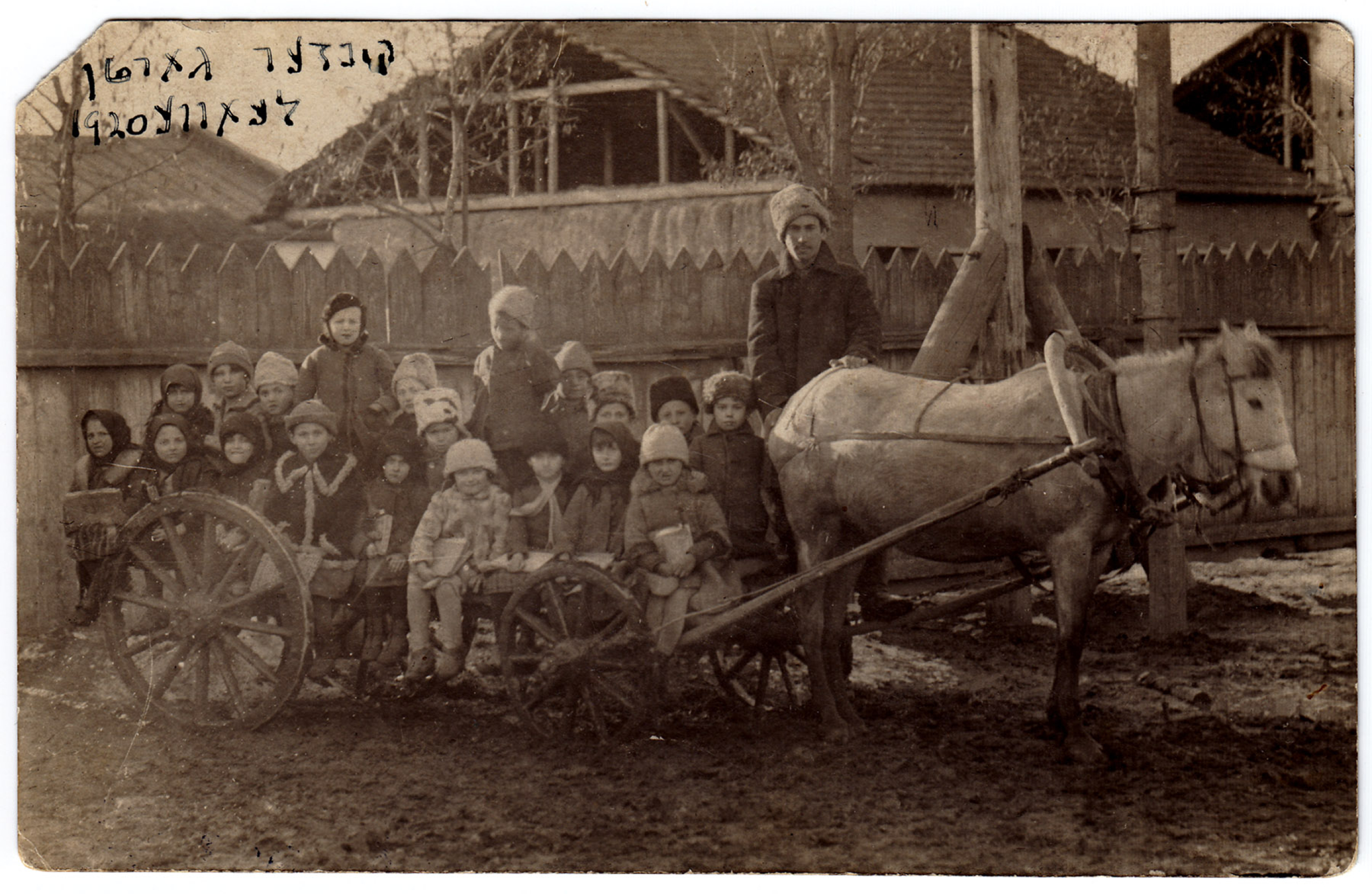 Children on a horse-drawn cart, Leova, Romania, 1920. Written in Yiddish on back of photo: “This is how Shaye used to bring the children to kindergarten.” YIVO Archives.