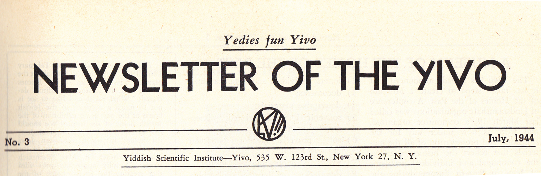 When this third American issue of Yedies was published in 1944, it was becoming all too clear that YIVO’s relocation to the United States would be permanent. The Vilna Ghetto had been liquidated by the Nazis in September 1943 and its remaining inhabitants deported to labor and death camps. YIVO lay in ruins with its archival and library collections destroyed, confiscated, or dispersed to hiding places.
