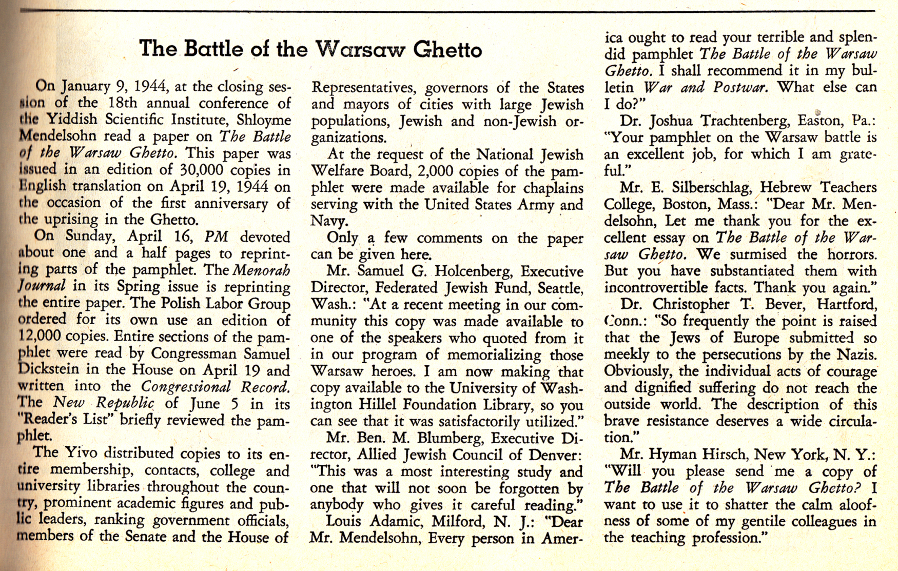 YIVO was among the first organizations in America to publish information about the Holocaust as it was unfolding, and among the first anywhere to report on armed Jewish resistance. The front page of the July 3, 1944 edition of Yedies highlights the publication of a brochure on the Warsaw ghetto uprising, which had taken place only a little over a year earlier.