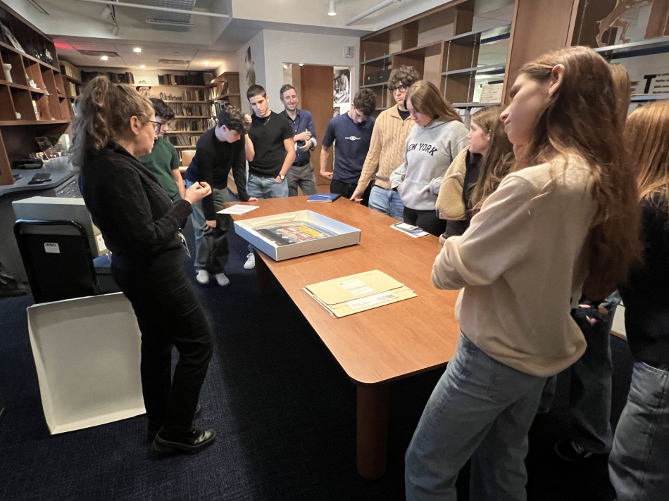 On November 7, 2025, ten 11th grade students accompanied by their teacher Max Lazar from The Abraham Joshua Heschel School visited the YIVO Learning and Media Center for a special lesson dedicated to Yiddish theater. During their visit, the students were introduced to the history of YIVO and the Esther Rokhl Kaminska Theater Museum. The students toured YIVO’s Centennial exhibitions, explored the Learning and Media Center, and after a presentation about the global history of the Yiddish theater, received a show-and-tell presentation of some of YIVO’s archival treasures by Director of Collections Stefanie Halpern.